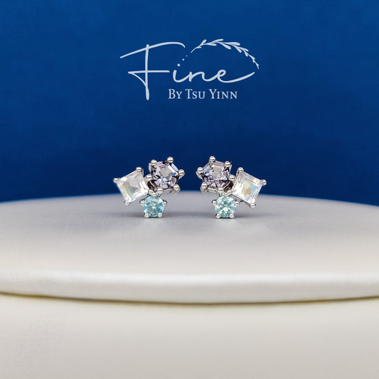 WG Cluster Moonstone, Blue Zircon and Dark Grey Spinel Studs