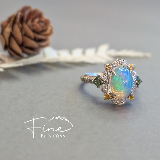 FBTY Kyra Ring with Ethiopian White Opal, Green Sapphires and Yellow Sapphires