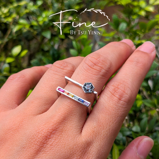 FBTY Karina Ring in White Gold with Hexagon Grey Spinel and Baguette Rainbow Sapphires