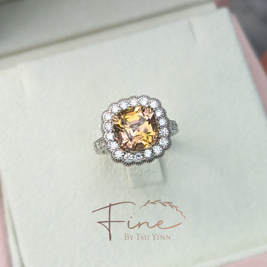 WG RG Sunset Tourmaline Double Bezel Diamond Halo Diamond Half Band Ring