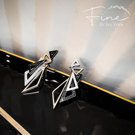 Mismatched Black and White Geometric Earring: Black Onyx, Mother of Pearl, White Diamonds and Black Diamonds Earrings