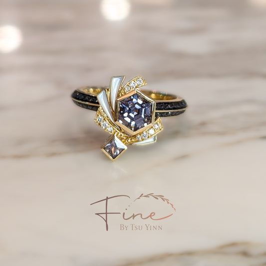 Hexagon Grey Spinel, Mother of Pearl, White Diamonds, Half Black Diamond Knife Band Ring