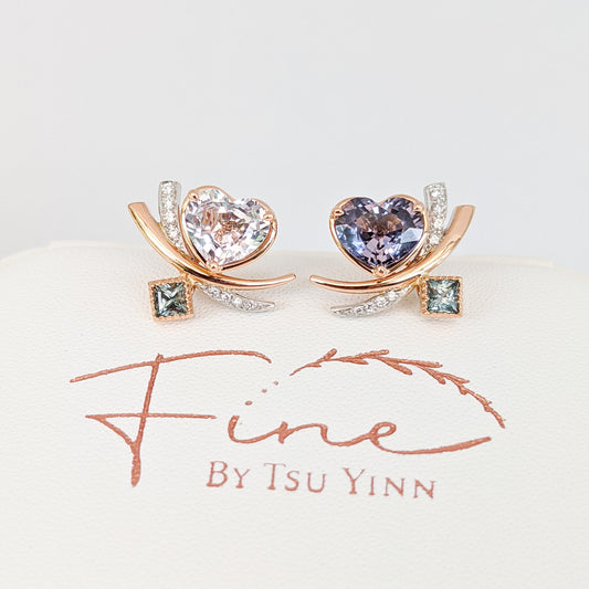 RG WG Mismatched Heart Spinels, Sapphire and Diamond Earrings