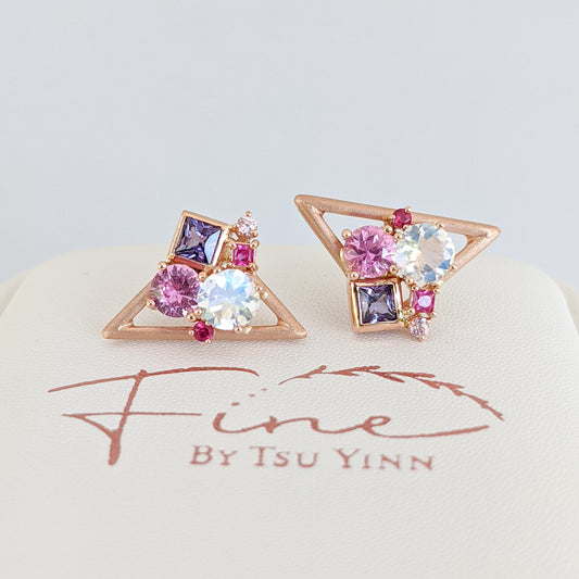 RG FBTY Cluster Earrings with Sapphires, Moonstones and Matt Triangular Frames