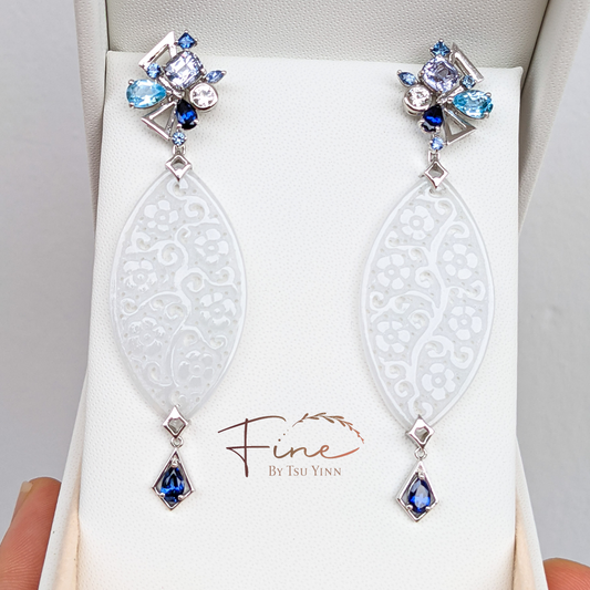 WG Spinel Sapphire Topaz Cluster Earrings with Carved Jade Drops with Blue Sapphires