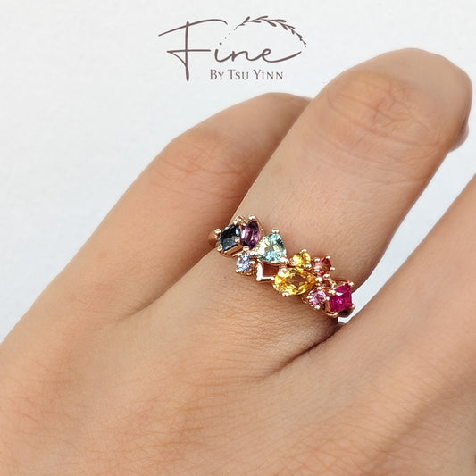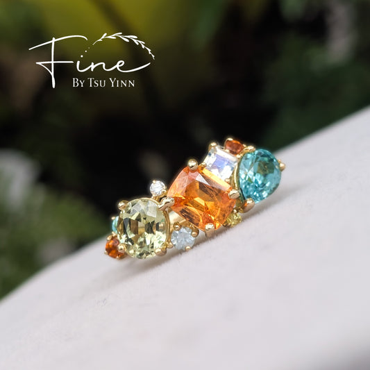 YG Messy Band with Spessartite Garnet, Chrysoberyl, Paraiba Tourmaline, Greenish-blue Tourmaline, White and Yellow Diamonds, Moonstone and Blue Zircon