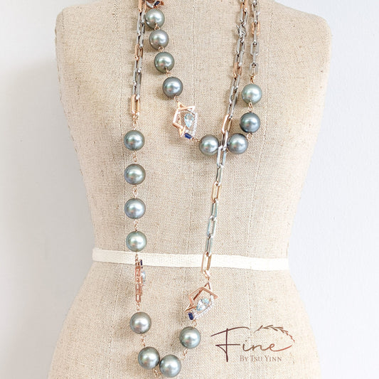RG WG Long Aquamarine Diamonds Chunky Tahitian Pearls Link Necklace
