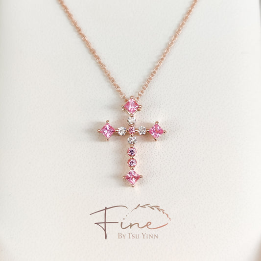 FBTY Princess Cross Necklace - Pink Sapphires, White Diamonds and Pink Spinels