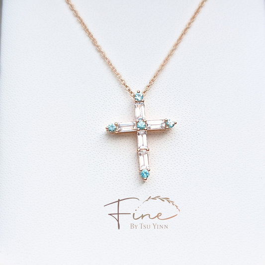 FBTY Baguette Cross Necklace - White Sapphires and Paraiba Tourmalines