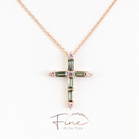 FBTY Baguette Cross Necklace - Light Green Sapphires and Pink Spinels