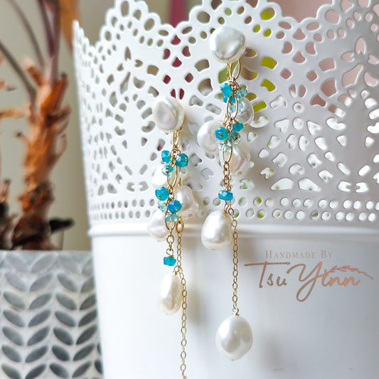 Multiwear Keshi Pearl Baubles Earrings with Blue Fire Opal and Aquamarine in YG