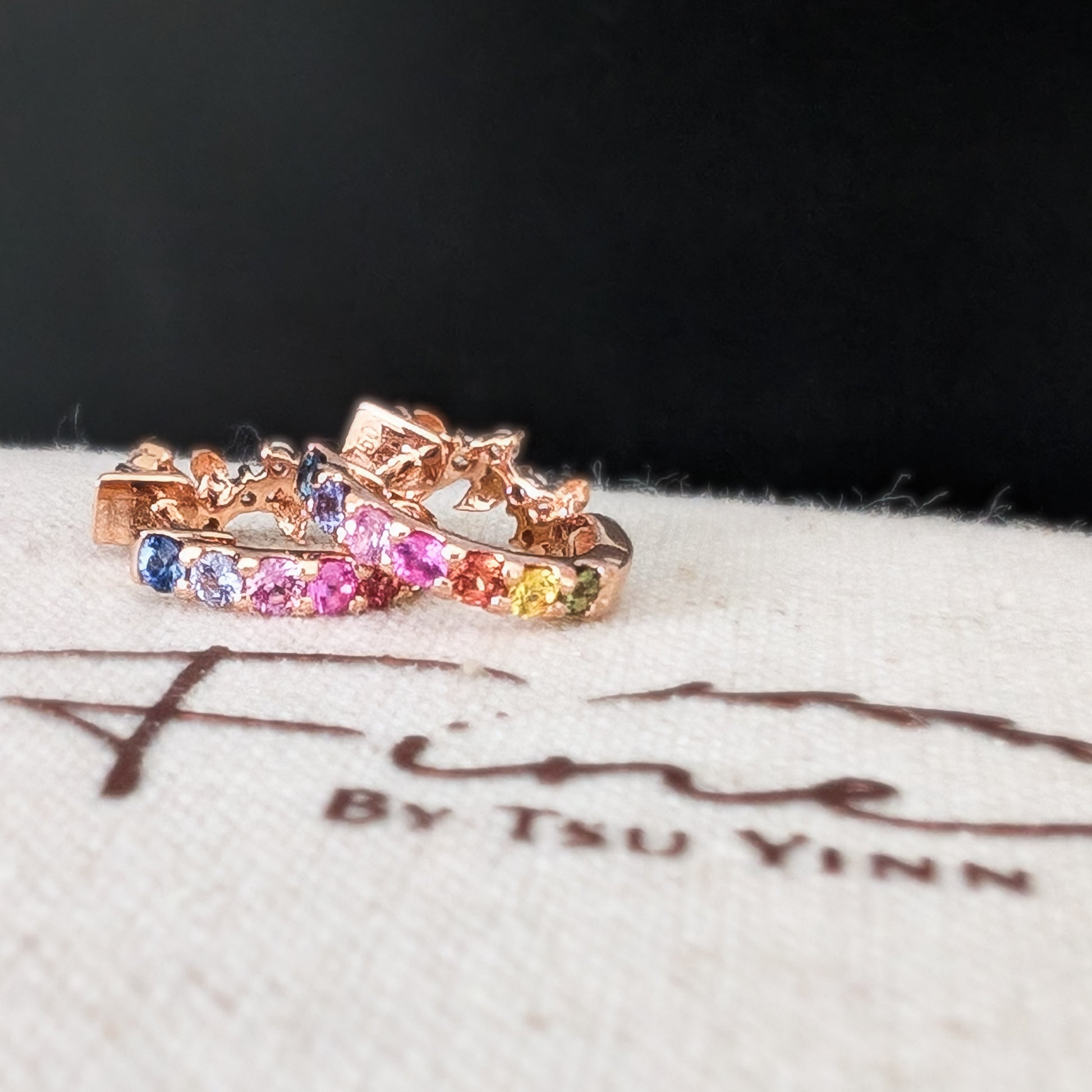 This pair of huggies are double-sided for 2 completely different looks. Round rainbow sapphires on one side and a floral motif on the other side with a sprinkling of white diamonds. Our FBTY Signature look!