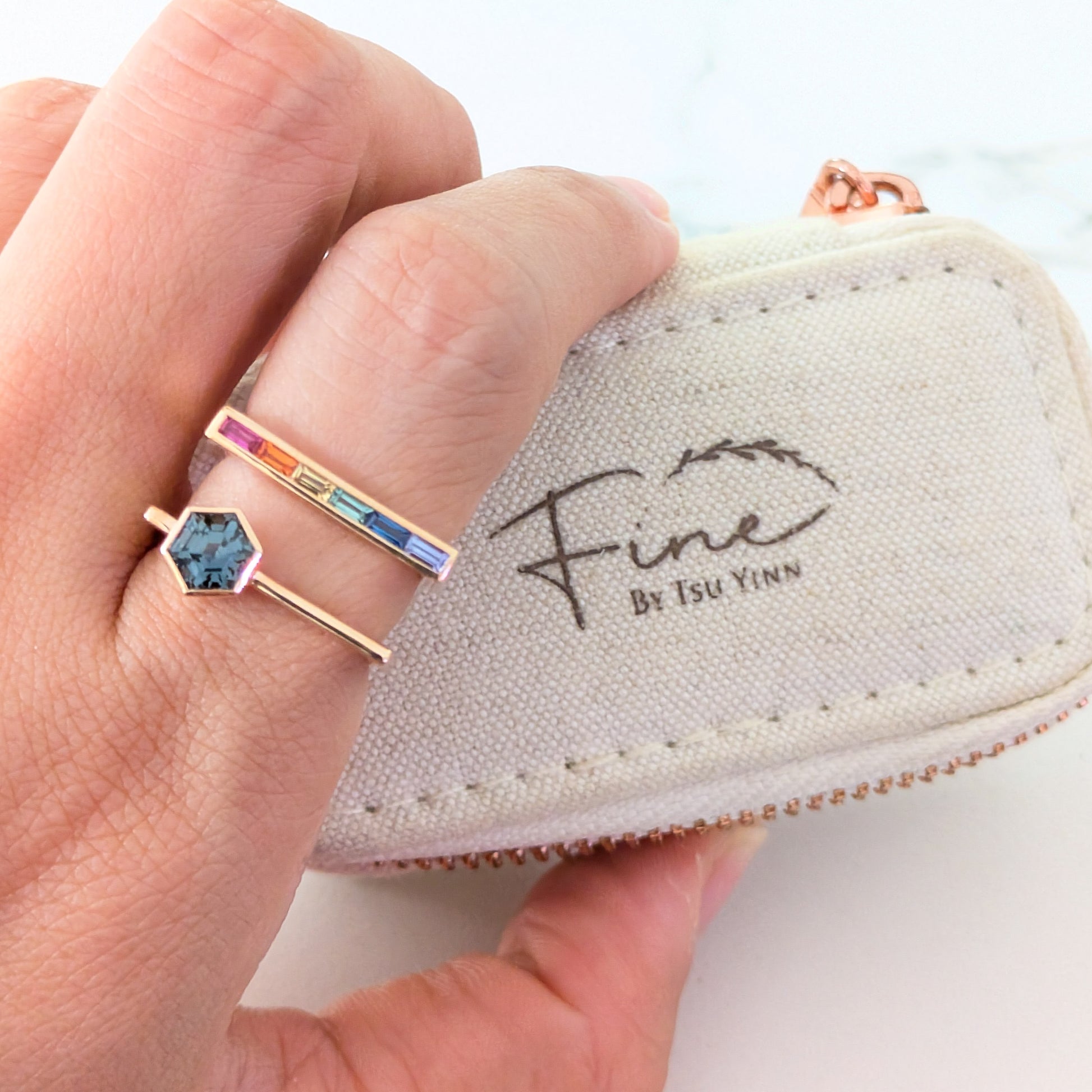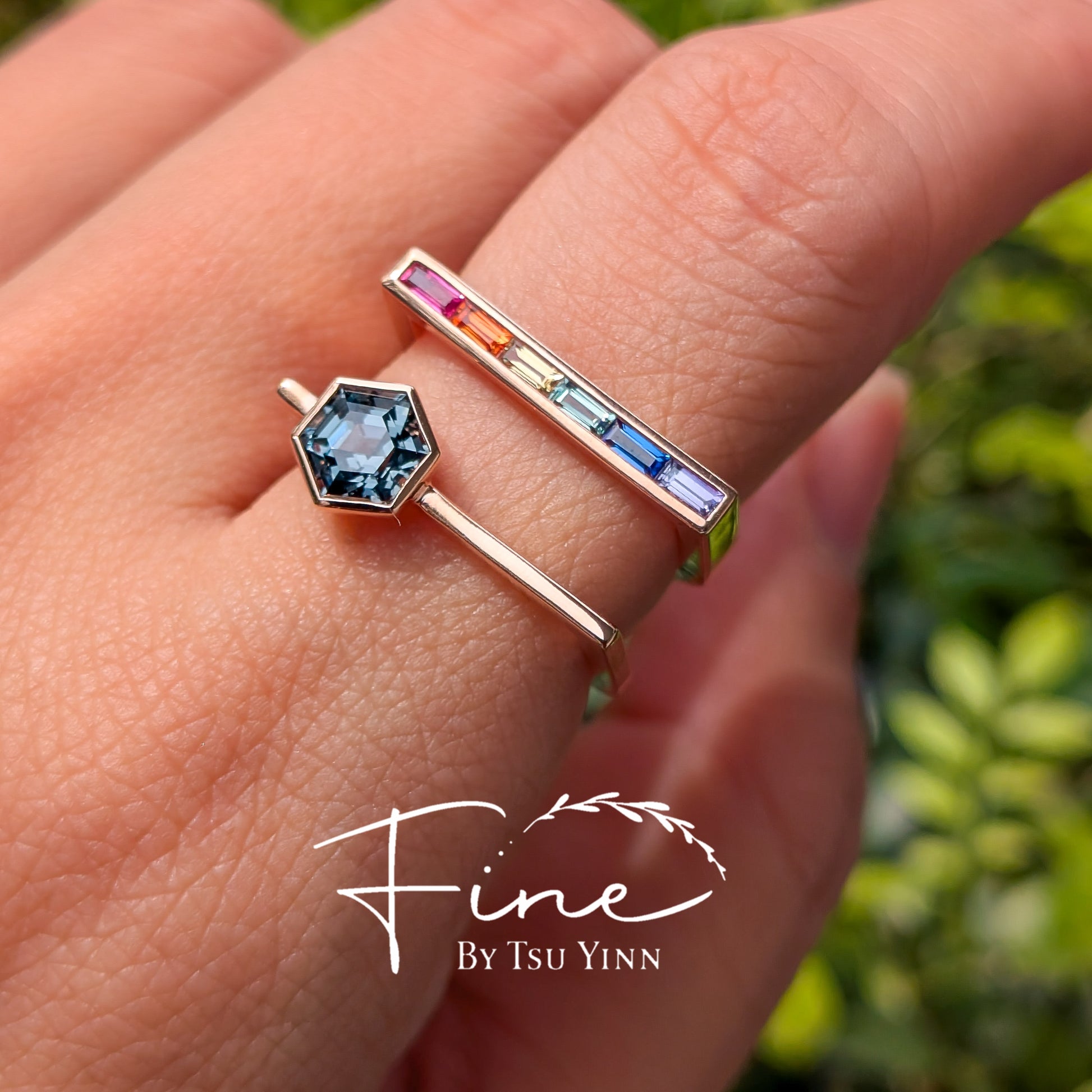 FBTY Karina Ring in Rose Gold with Hexagon Grey Spinel and Baguette Rainbow Sapphires