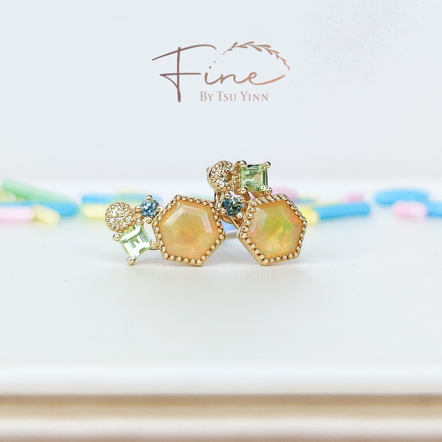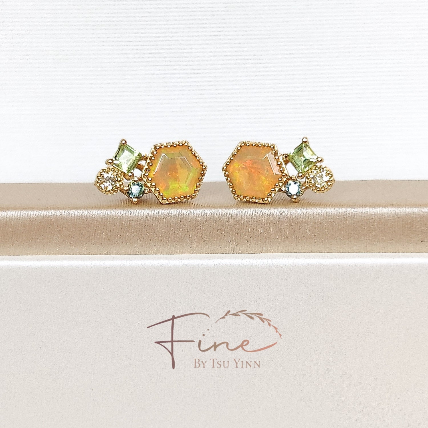 FBTY Petite Studs: Hexagon Opals with Green Sapphires, Yellow Diamonds and Peridot