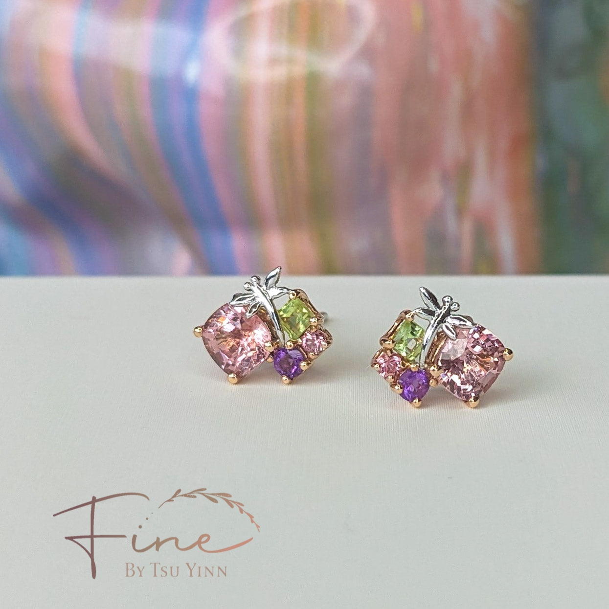 FBTY Petite Studs: Peach Pink Spinels with Peridot, Spinels, Amethyst and our signature dragonfly