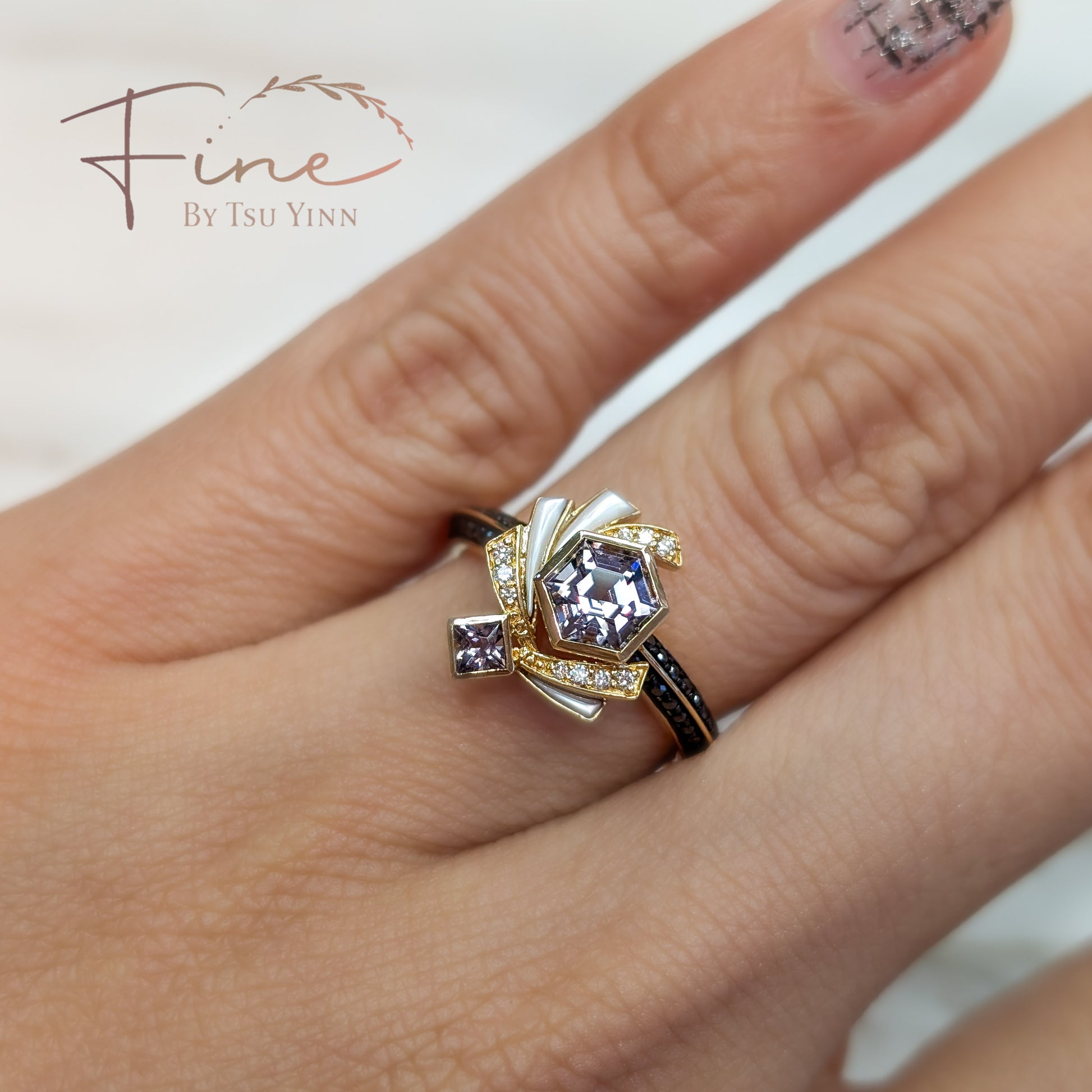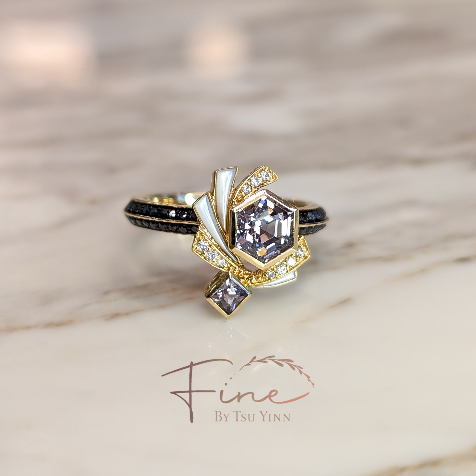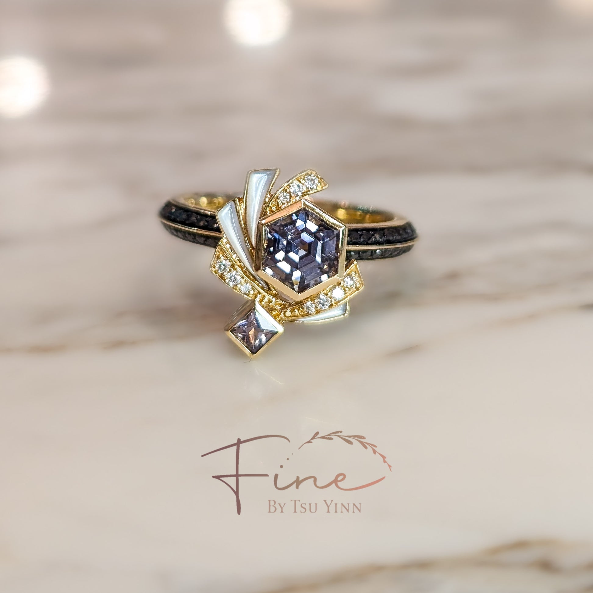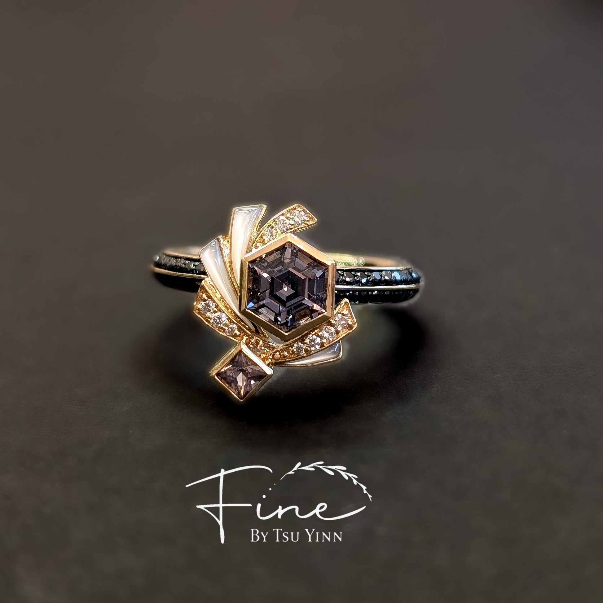 Hexagon Grey Spinel, Mother of Pearl, White Diamonds, Half Black Diamond Knife Band Ring