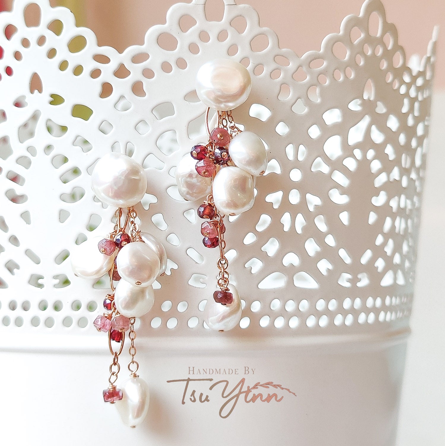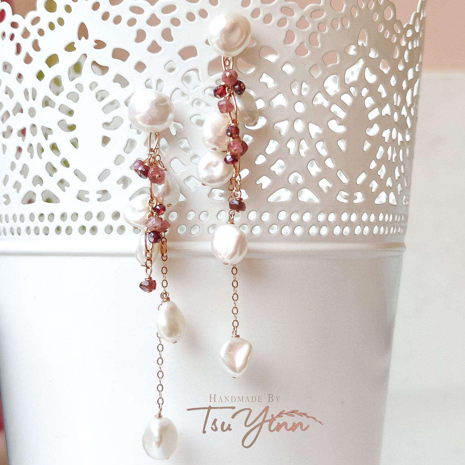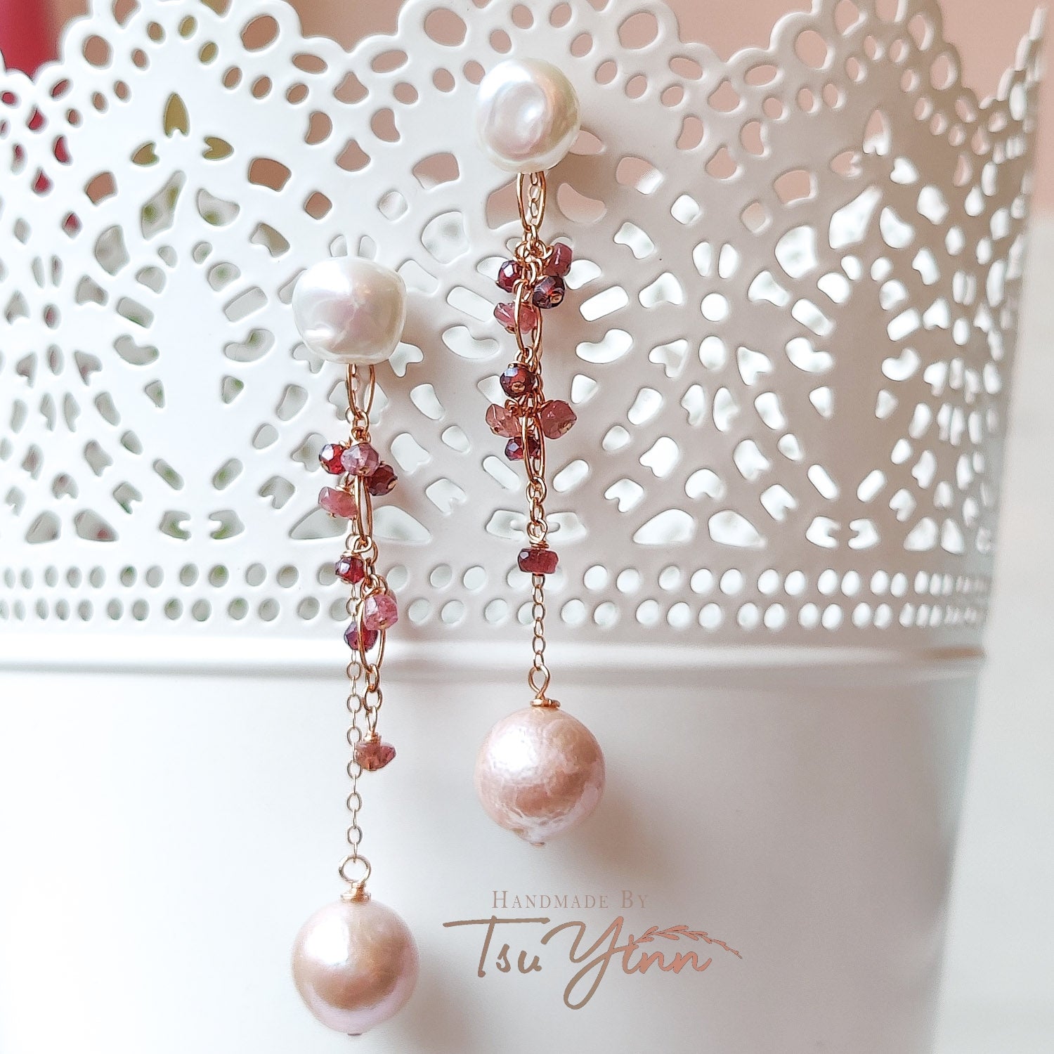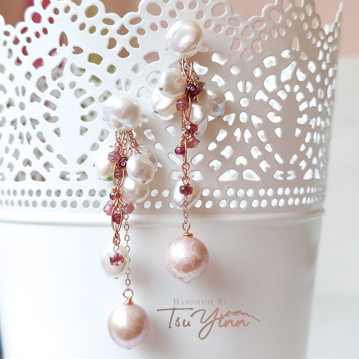 - Keshi pearls, mauve pink freshwater pearls and garnet rondelles on dangles