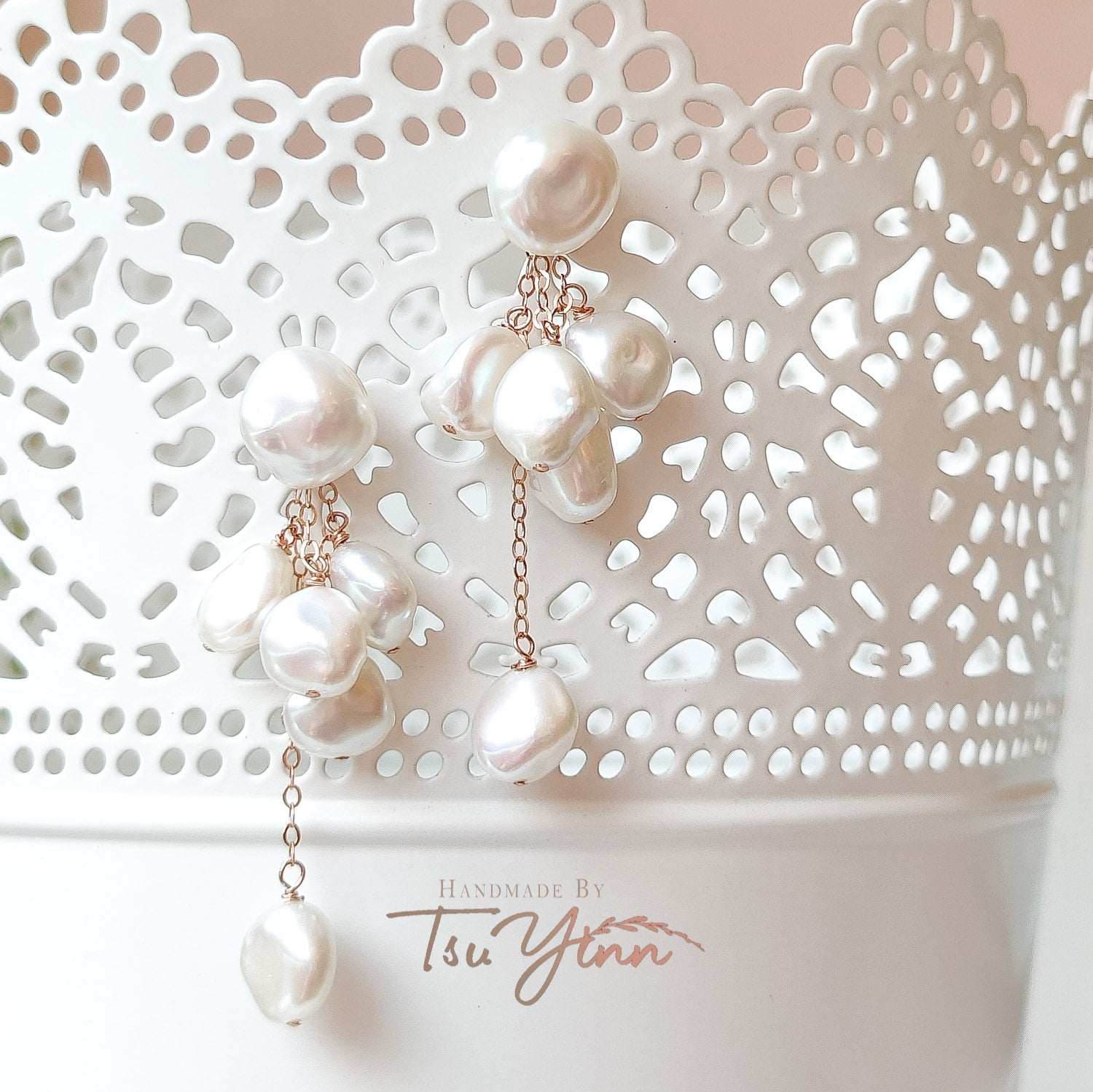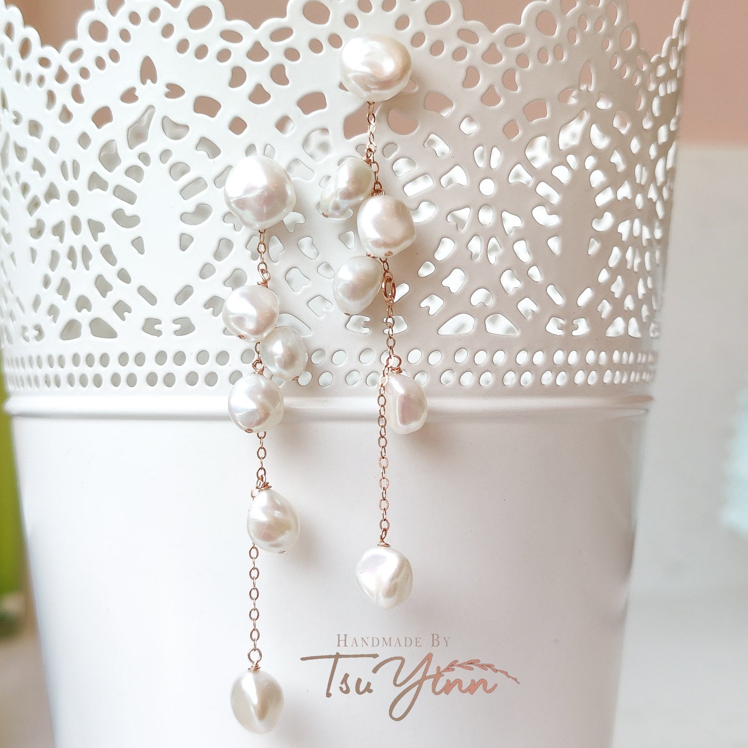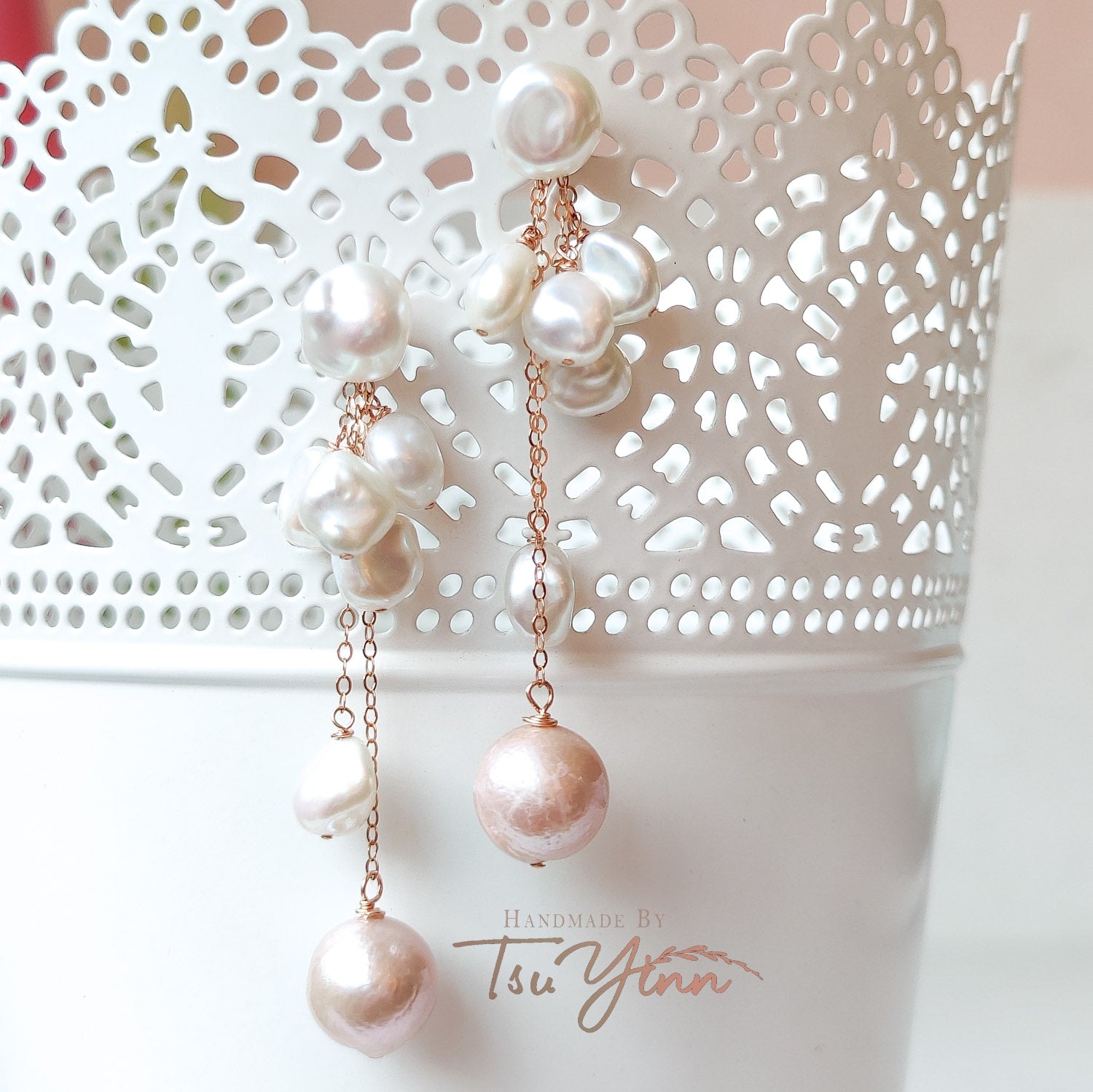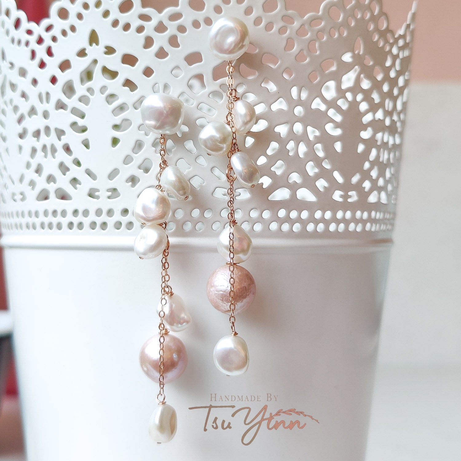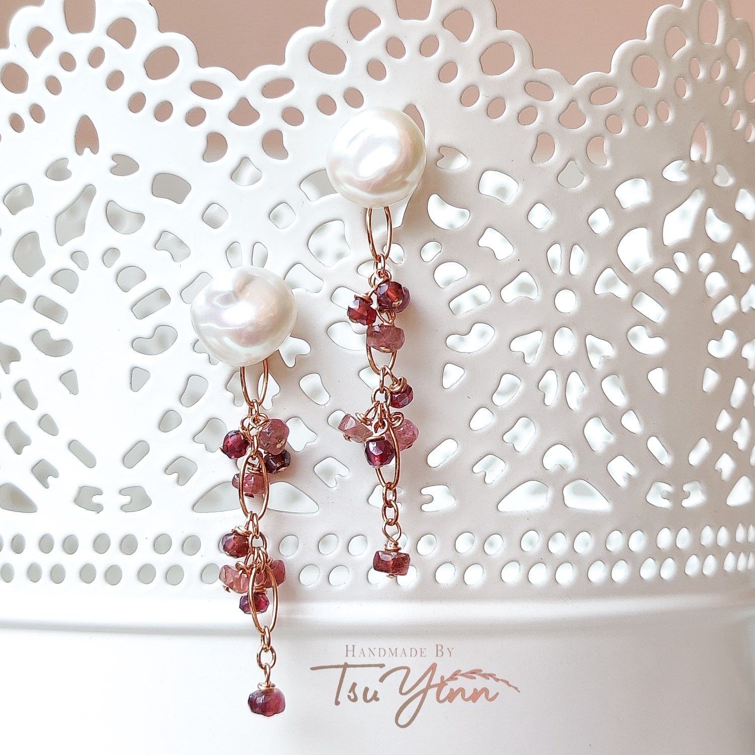 - Keshi pearls, mauve pink freshwater pearls and garnet rondelles on dangles