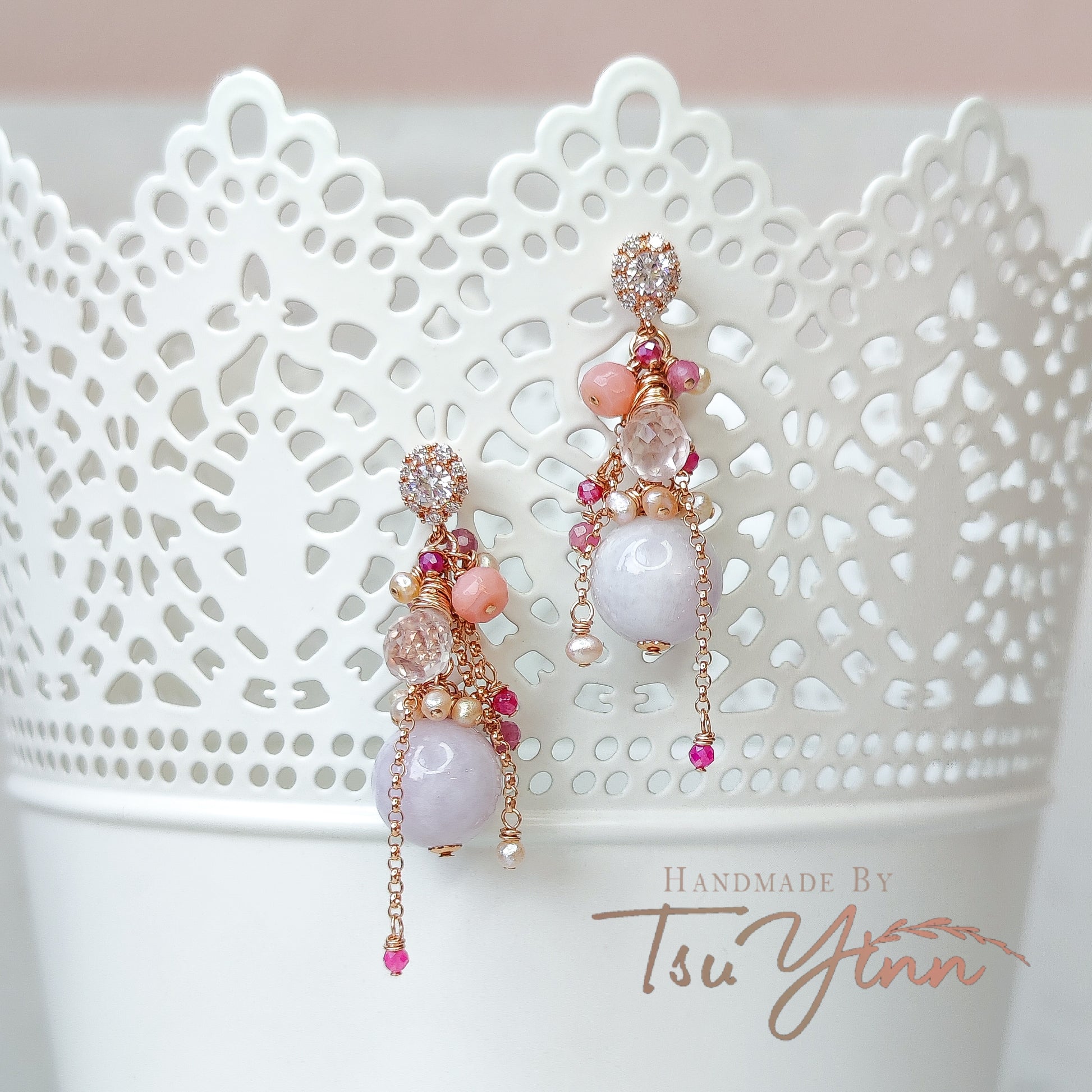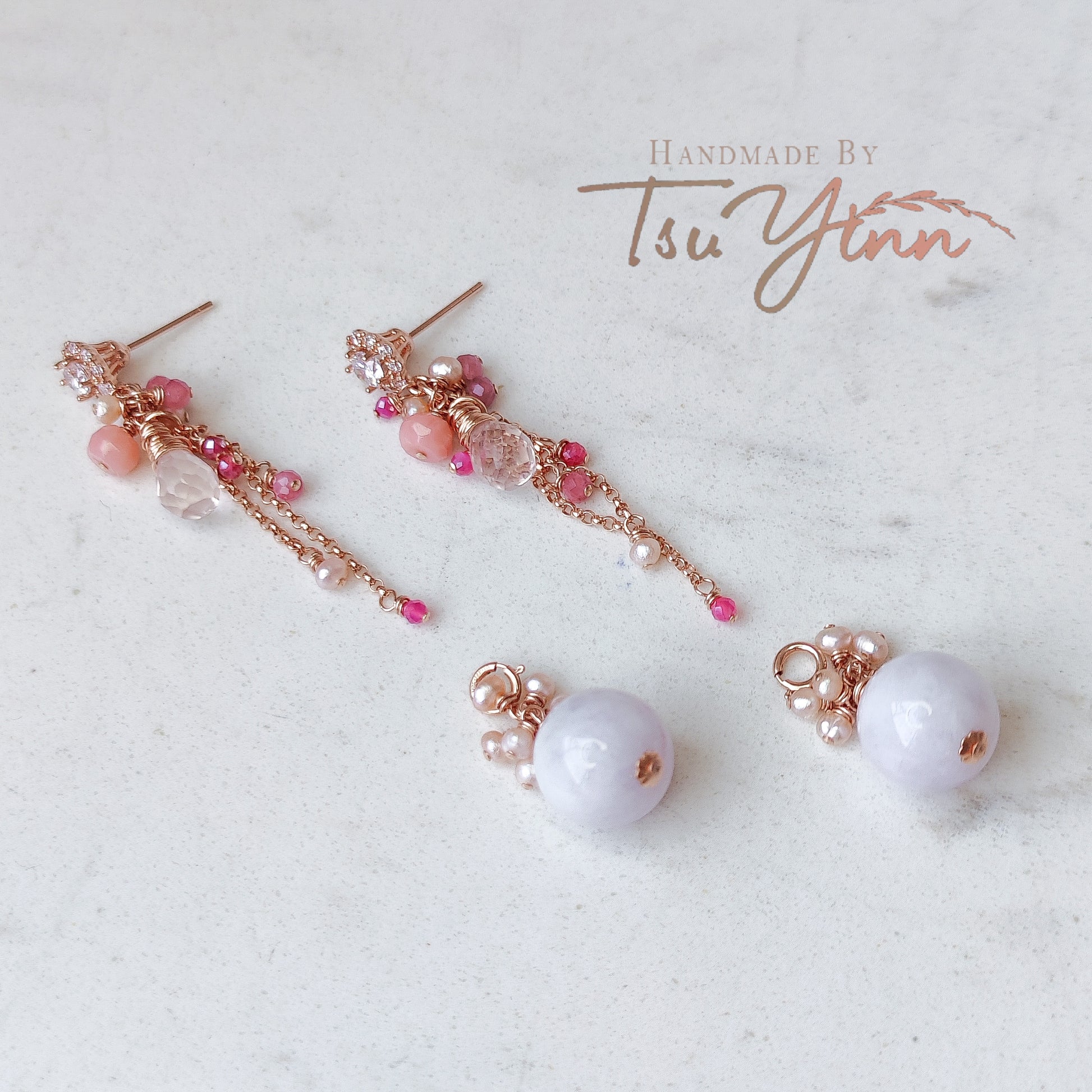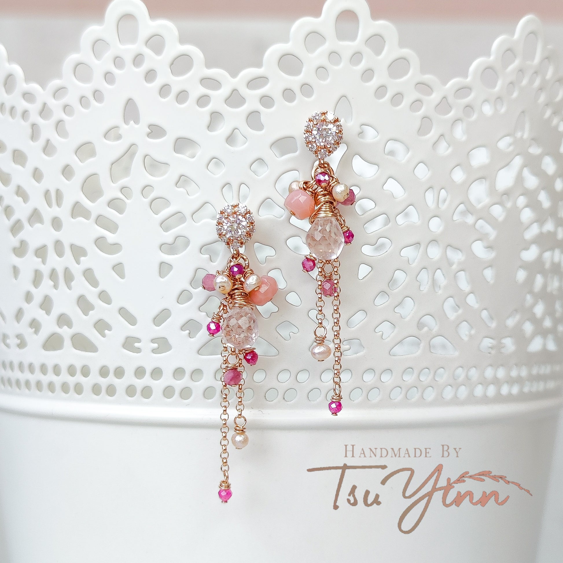 - Pink tourmaline, mystic garnet, peach freshwater pearls and pink coral rondelles
