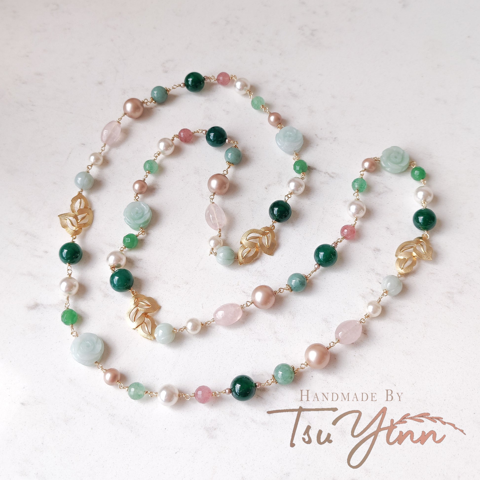- Jade, rose quartz, green agate, pink apatite, green apatite and aventurine beads