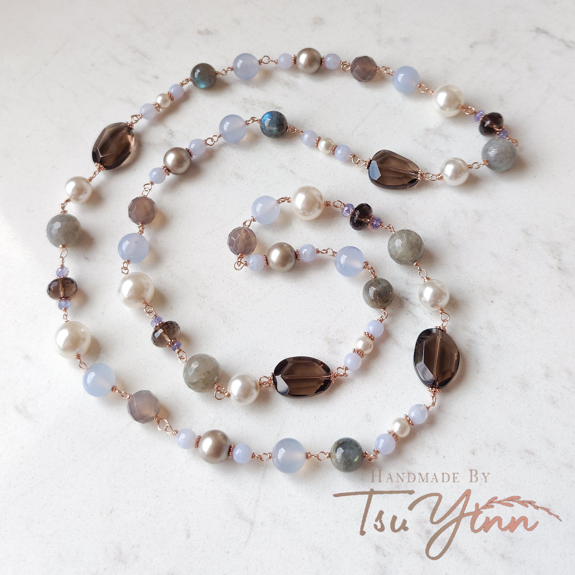 - Smoky quartz, labradorite, tanzanite, blue chalcedony, grey agate and blue lace agate beads