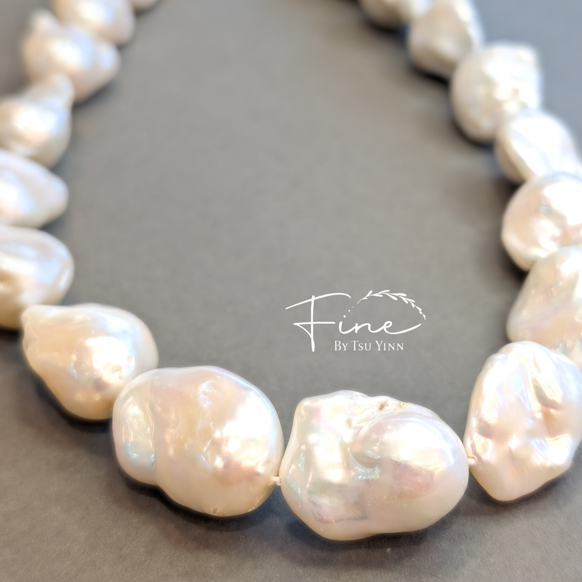 15-18mm white baroque pearls necklace strung with 14k white gold clasp.