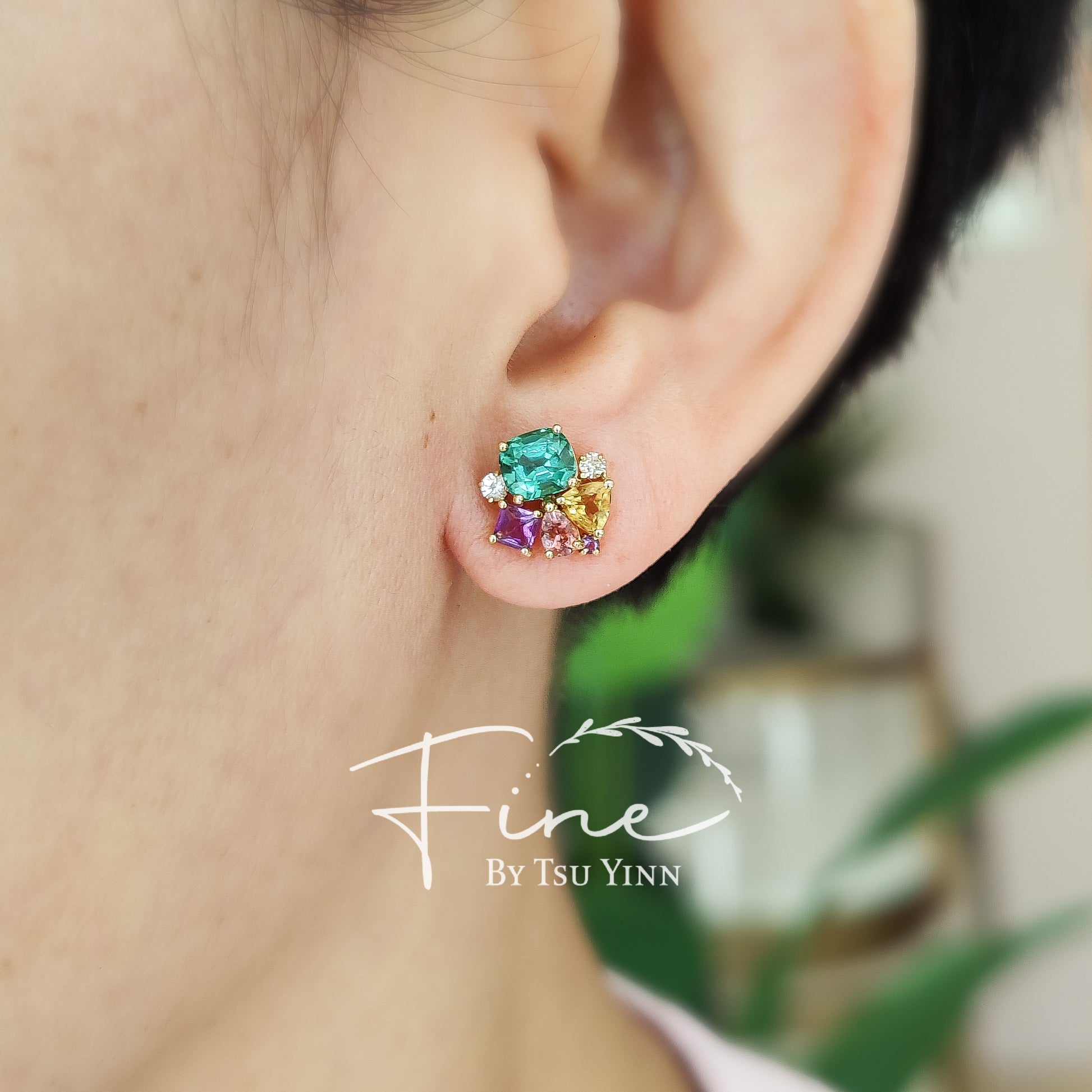 YG Cluster Green Tourmalines, Sapphires, Amethyst, Diamond Studs