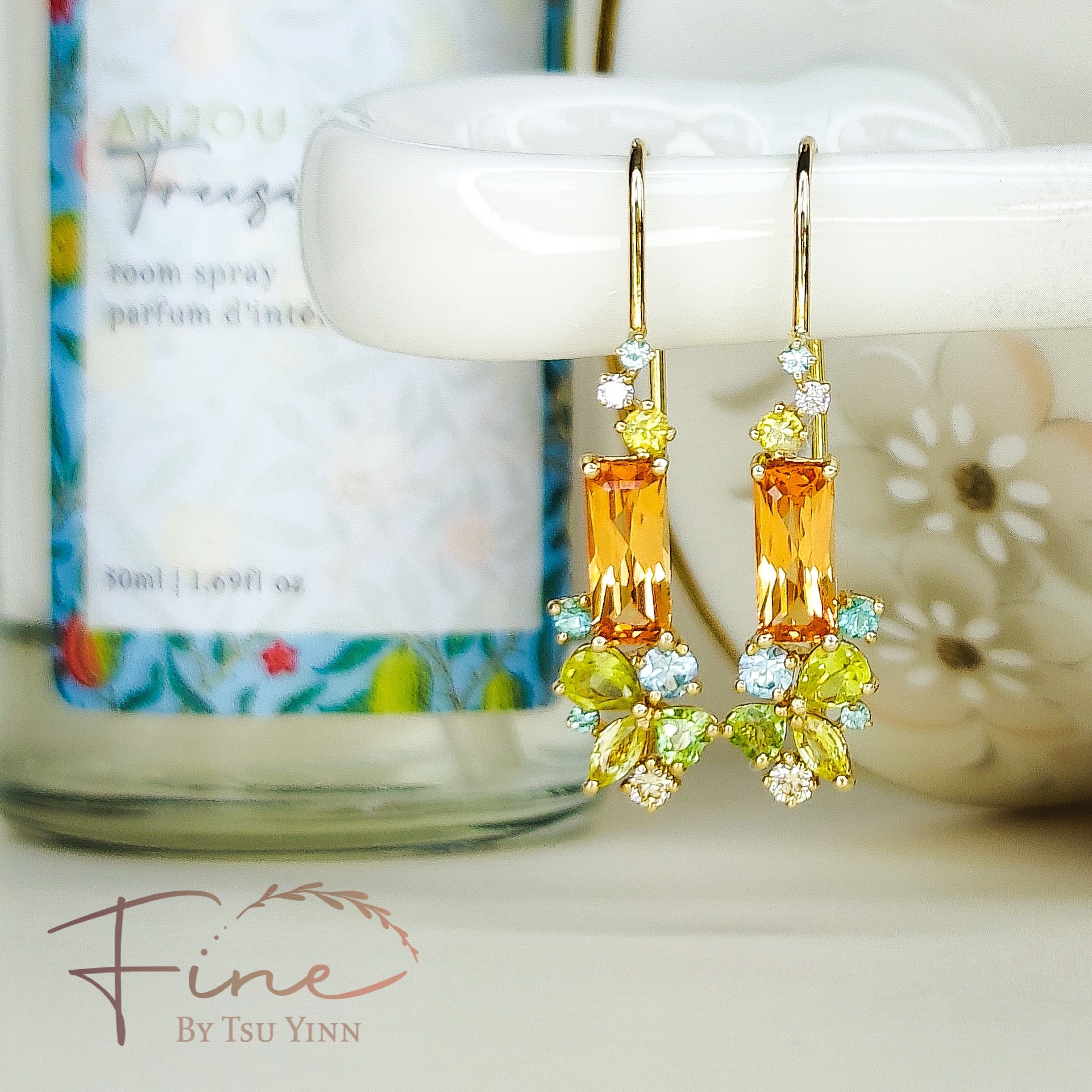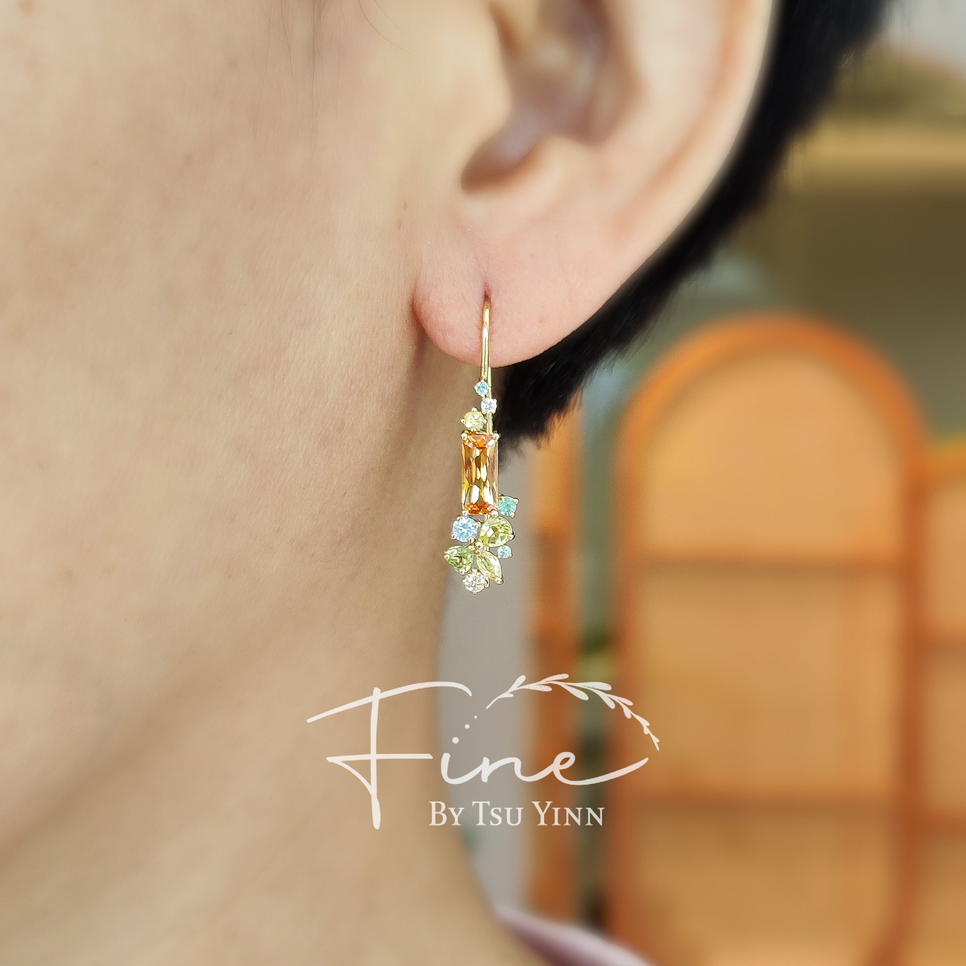 YG Spessartite Garnet Cluster Long Hook Earrings